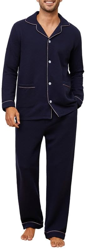 Mens Pajama Set Soft Warm Long Sleeve Quilted Fabric Cotton Cozy Sleepwear Button-Down Pjs