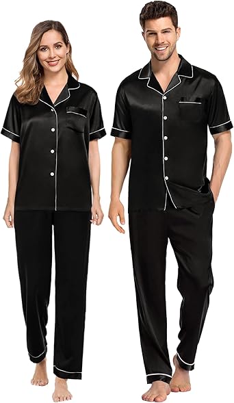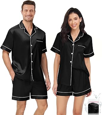 Silk Matching Pajamas Set for Couples Women Men Stain Short Sleeve Sleepwear Button Down 2 Pcs Pjs Sets S-XXL