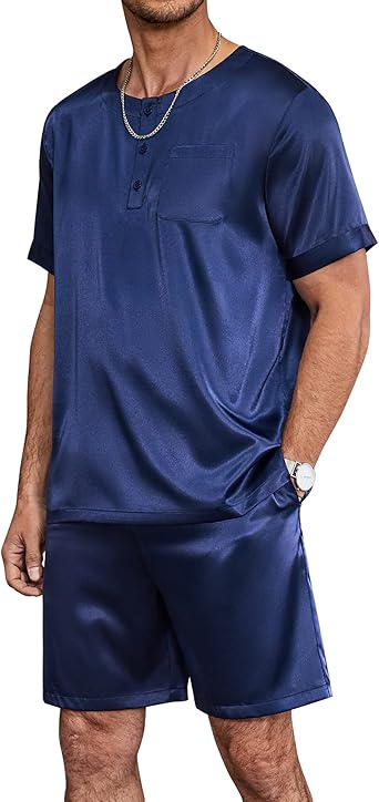 Men Satin Pajamas Set 2 Piece Silk Sleepwear Shorts Button Down Tops Loungewear with Pockets