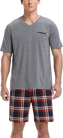Men's Pajama Sets Soft 2 Piece Pj's Set Short Sleeve Cotton Top and Plaid Pants for Loungewear Sleepwear with Pockets