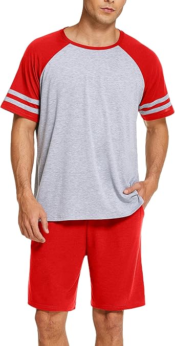 Mens Pajama Short Sets Short Sleeve Crewneck Pajama Lounge Set Raglan Sleepwear