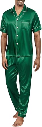 Men's Silk Pajamas 2 Piece Short Sleeve Button Down Top and Pants Matching Pj's Set with Pockets