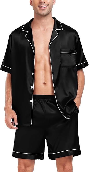 Men Satin Pajamas Set 2 Piece Silk Sleepwear Shorts Button Down Tops Loungewear with Pockets