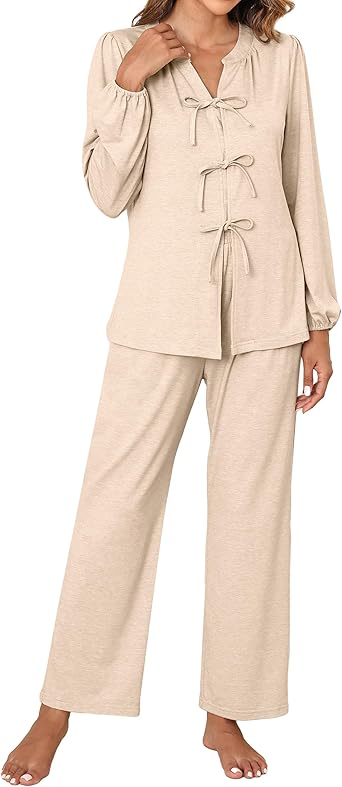 Women's Pajamas Set 2 Piece Lounge Pjs Sets Fall Outfits Long Sleeve Tie Front Tops Loungewear with Pockets