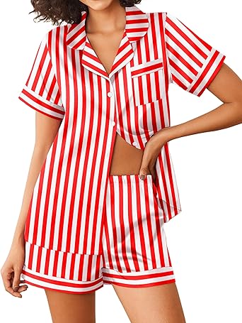 Womens Silk Satin Pajama Sets 2 Piece Short Sleeve Sleepwear Button Down Top and Shorts Striped Pjs Lounge Sets S-XXL