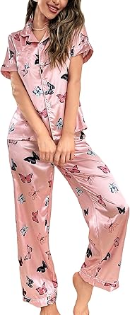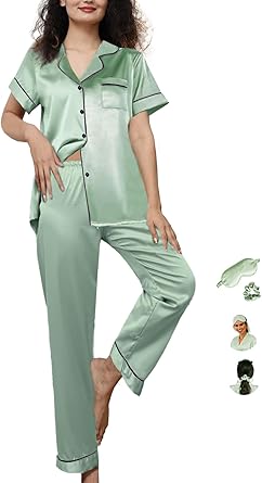 Womens Pajamas Set XS-4XL Silk Satin Pajama Sets Short Pj Sets Button Down Pjs Set Loungewear Sleepwear