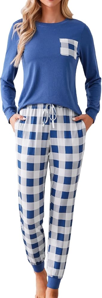 Christmas Pajamas for Women Long Sleeve Pj Set Soft Sleepwear Plaid Pant with Pockets
